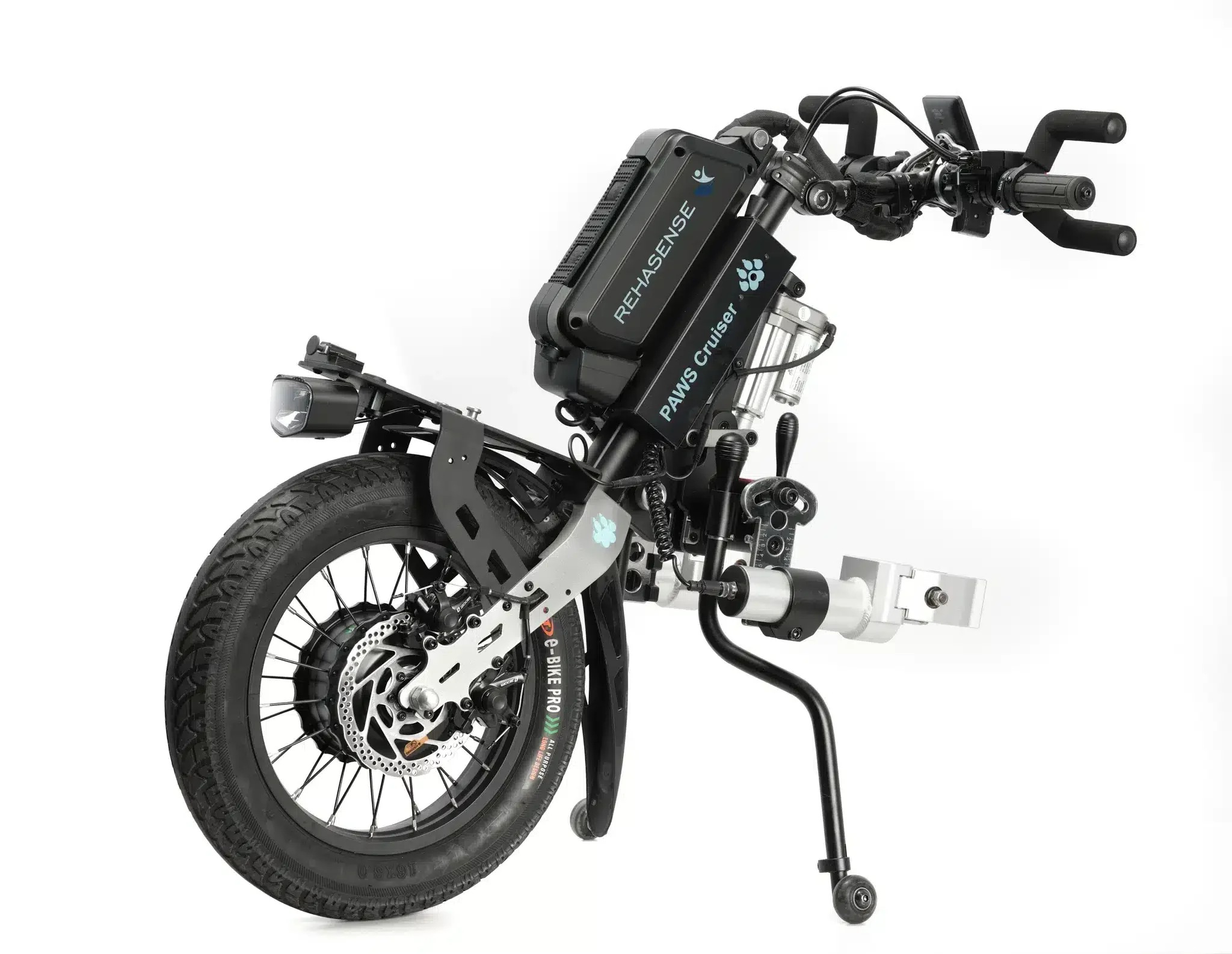 De PAWS cruiser is een handige aankoppelunit voor je eigen handbewogen rolstoel, en gaat bijzonder goed over onverharde paden. Binnenkort te huur via ons platform.