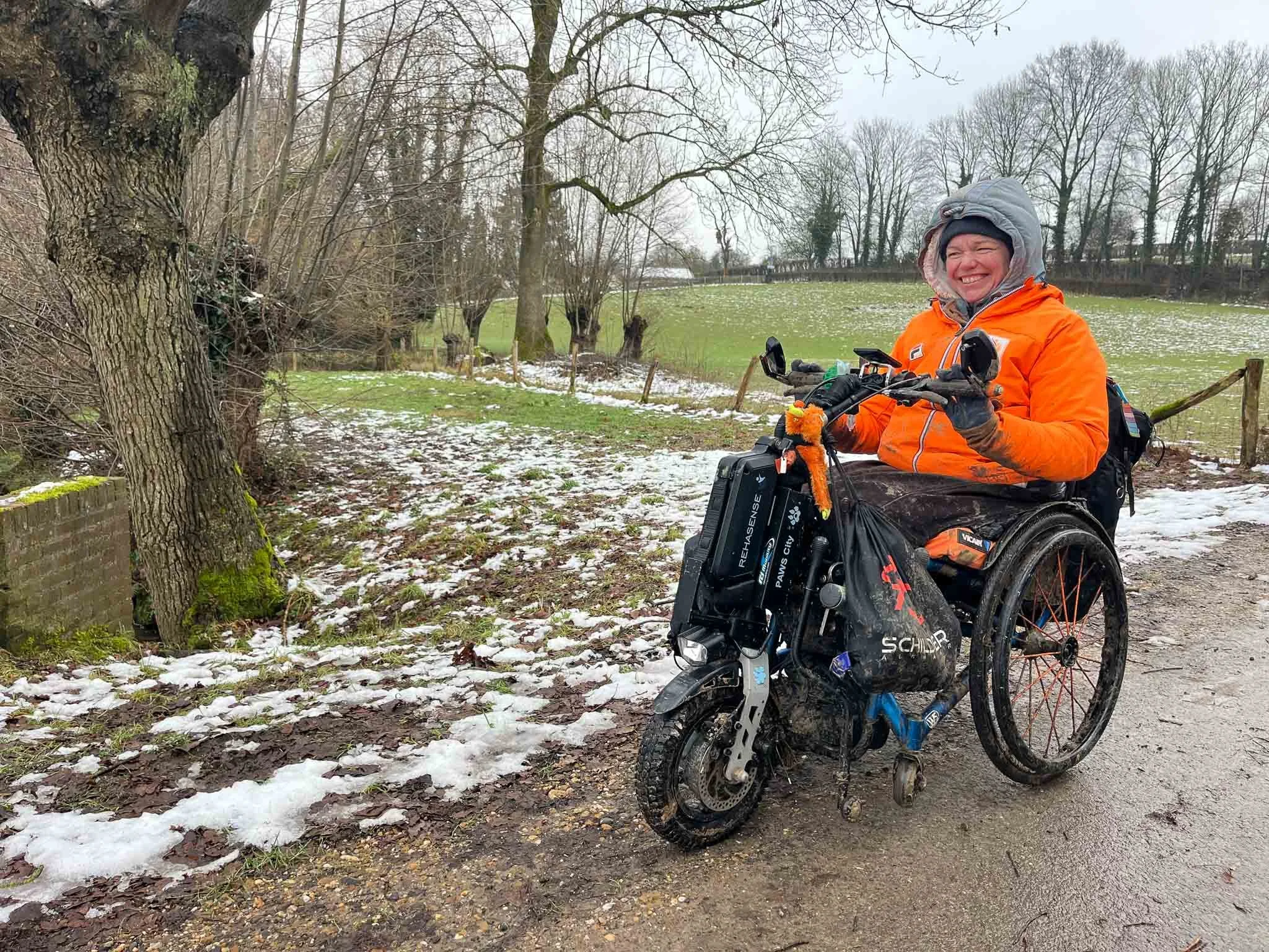 🗺️ Aan de start is de weg enorm modderig wanneer het veel heeft geregend. Dit gaat lang goed met de Mountain e-Trike, maar na 4km is een kleine omleiding nodig voor een onbegaanbaar diep moeras bij het Schuilwater.